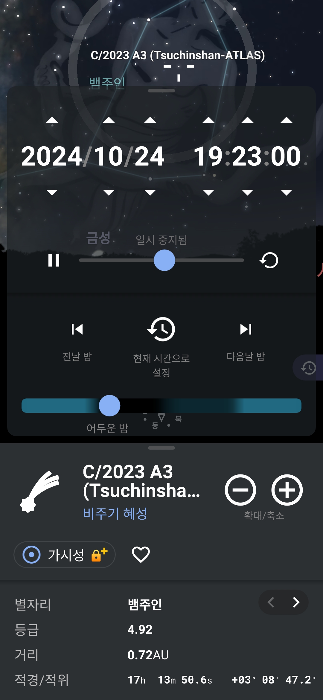 2. 검색 창에서 C/2023 A3를 검색하면, 현재 시간 기준 혜성의 위치를 하늘에서 찾아줍니다. 현재 새벽에 보이는 혜성의 위치와, 며칠 뒤 저녁에 관측 가능한 시간대를 정확히 확인할 수 있습니다.